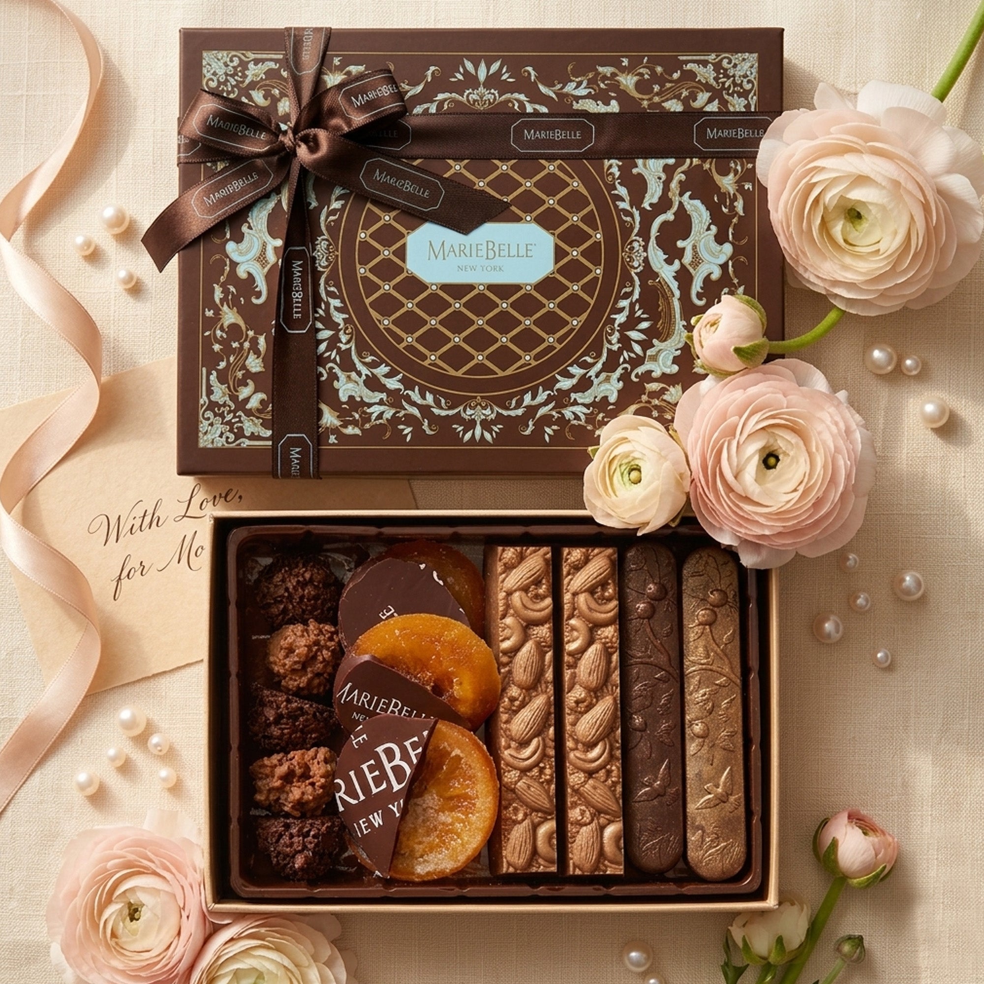 Discover the timeless elegance of MarieBelle New York's Golden Tablets, a luxurious collection of sixteen gold-dusted chocolate cat tongue tablets, handcrafted in both smooth milk and rich dark chocolate. Each delicate piece is a masterpiece of artisanal confectionery, offering a melt-in-your-mouth experience that balances indulgence and refinement. Beautifully presented in MarieBelle’s signature blue box, these shimmering tablets make an exquisite gift for any occasion or an irresistible treat to savor and snack on yourself. A touch of gold, a taste of perfection, crafted to delight in every bite.